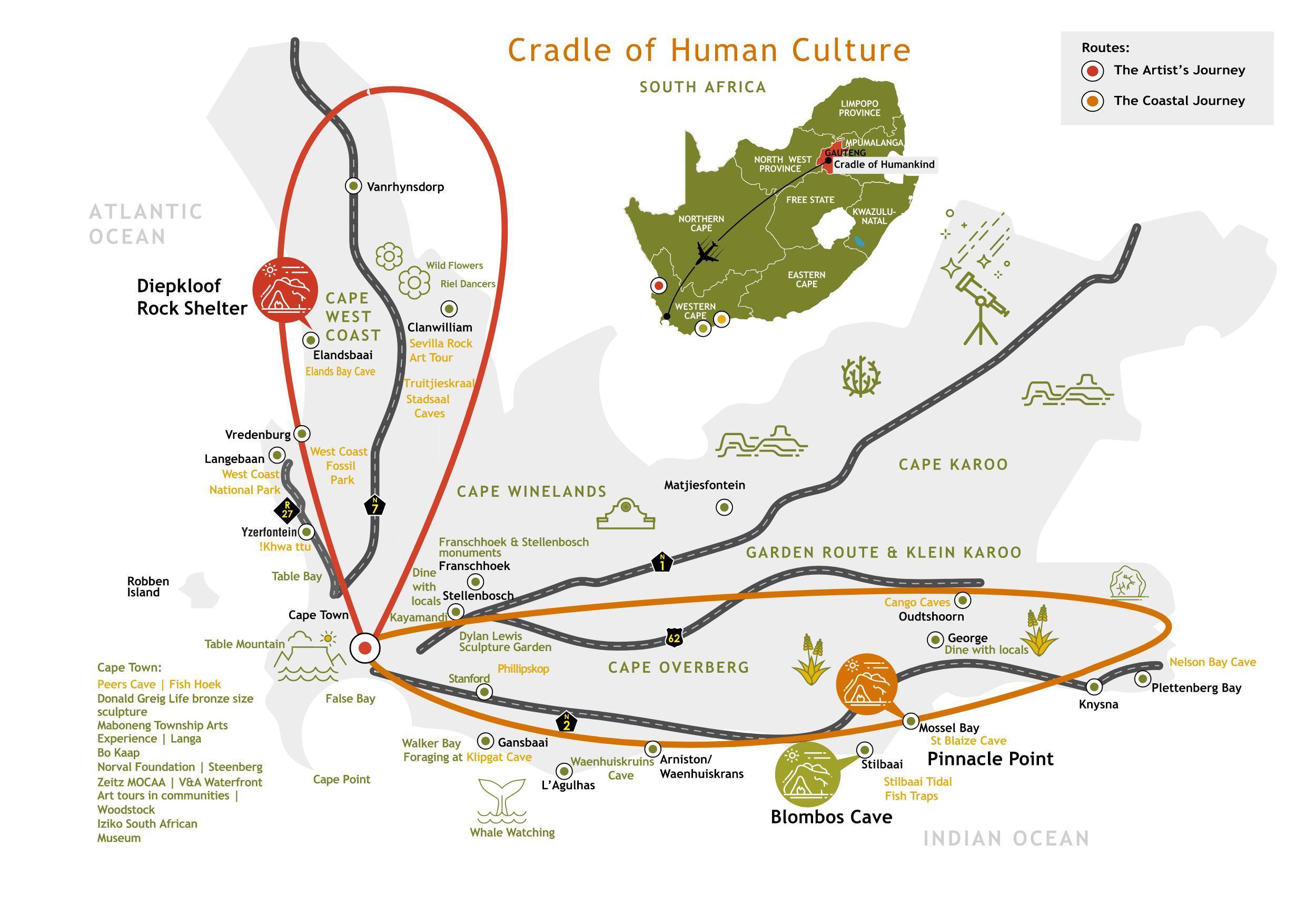 The Cradle of Human Culture comprises of two routes The Artist’s Journey along the Cape West Coast (Weskus) and The Coastal Journey along the Southernmost Cape Coast